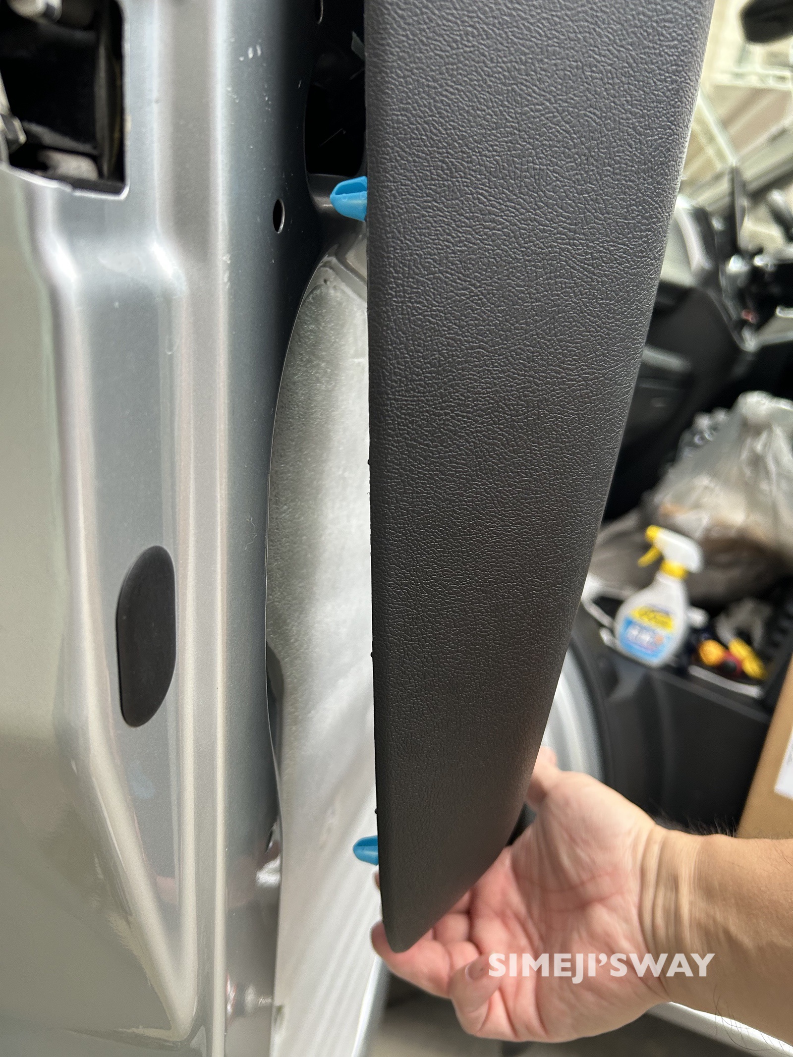 この青いツメ2個にも注意です。これと複数のネジで固定されています。 この内張にもシンサレートを貼りました。