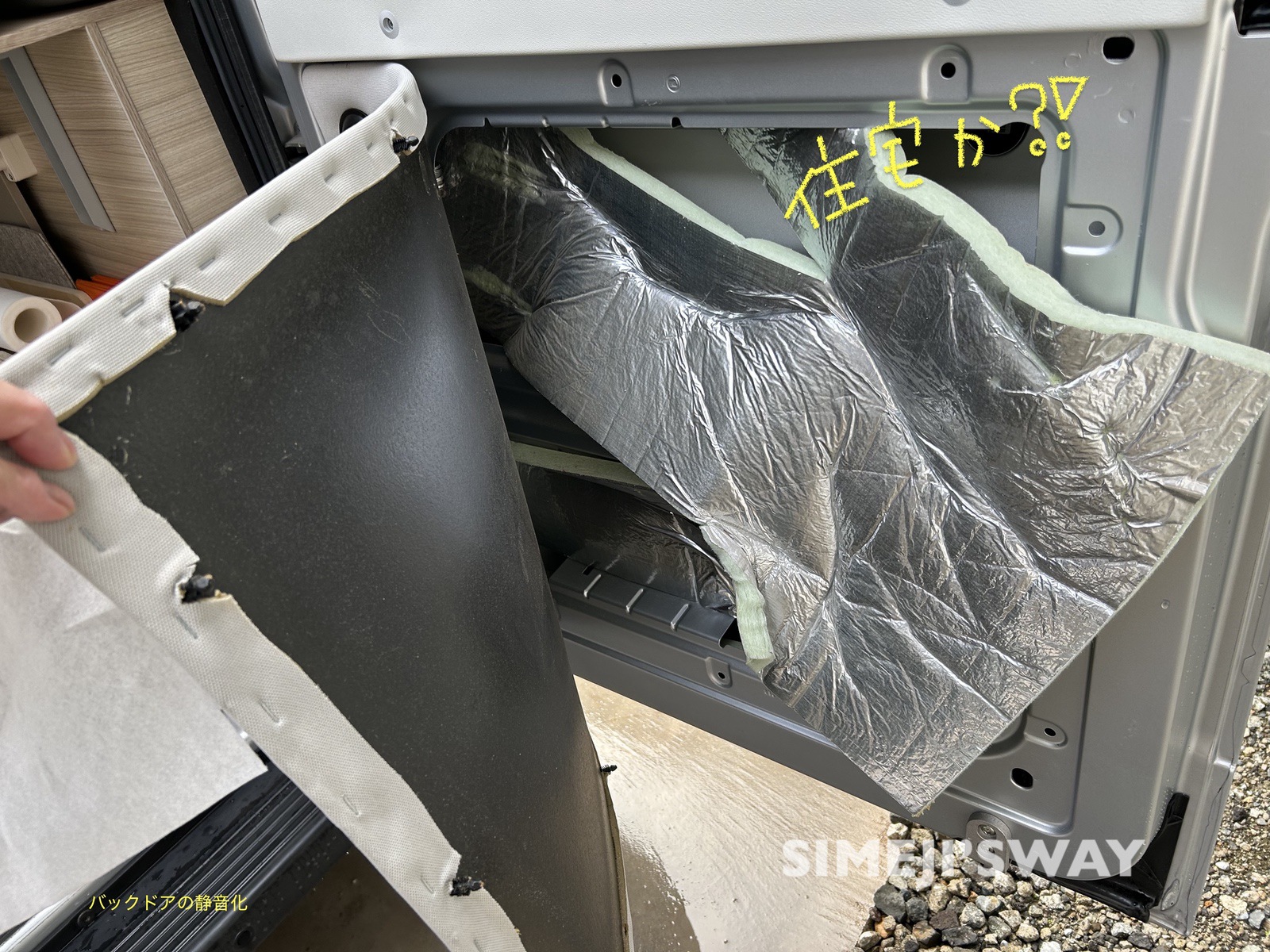 リアの観音ドアの中も同じ。 断熱材が差し込まれているだけなのでAmazonベーシックの制振シートを貼り、シンサレートを詰め込みます。